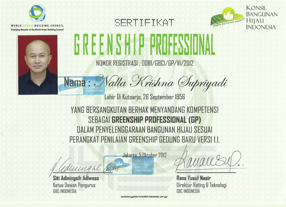 • Certified Greenship Professional - No. 0081/GBCI/GP/VI/2012
