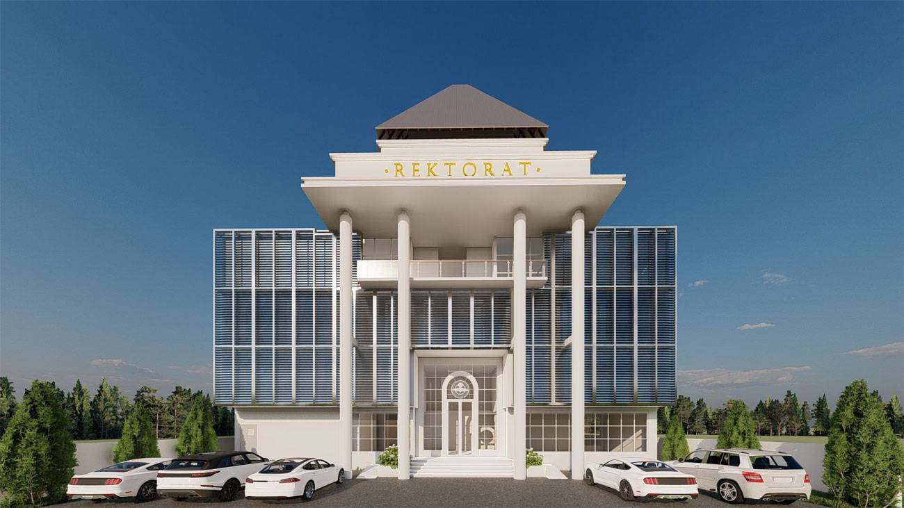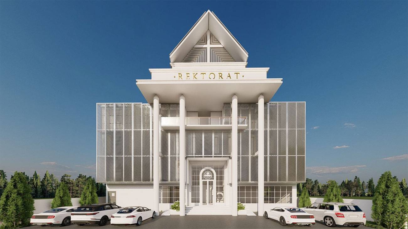 Kedua opsi menegaskan aksialitas dan kejelasan hierarki ruang, dengan komposisi simetris, kolom-kolom monumental, dan sumbu masuk yang tegas sebagai simbol keteraturan, wibawa, dan keterbukaan institusi. Bangunan dirancang sebagai titik orientasi kampus, sekaligus ruang transisi antara aktivitas akademik dan kontemplatif.