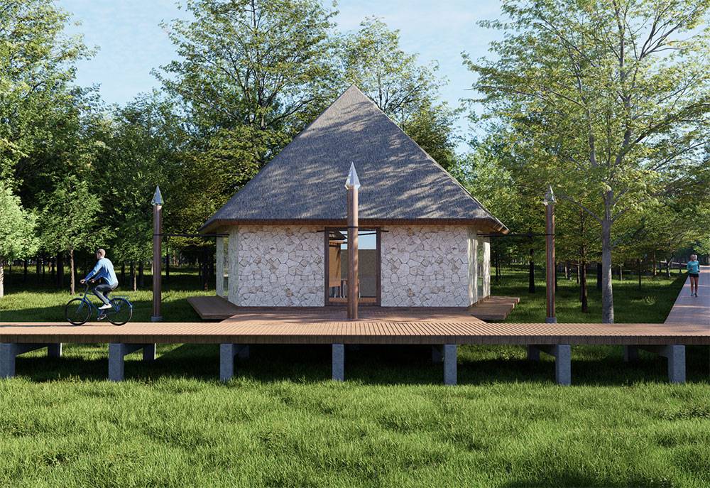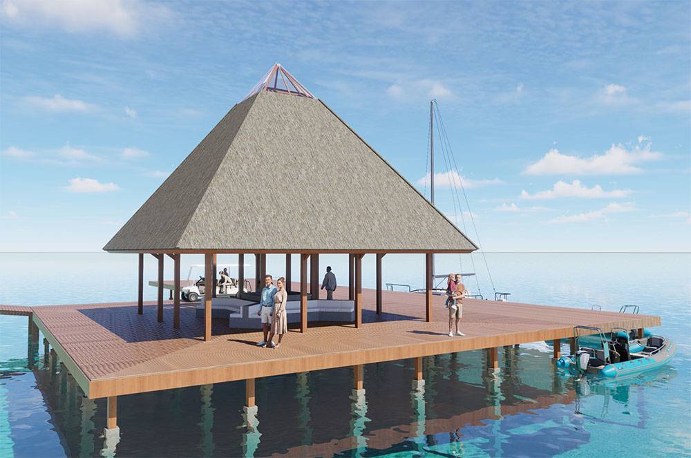 Construction materials are carefully selected to respect both environmental conditions and logistical realities. Primary materials include wood, natural stone inspired by Stone Town, bamboo, glass, and African thatch (rumbia or alang-alang). The use of reinforced concrete is intentionally minimized due to transportation challenges and environmental sensitivity, while steel structures are discouraged because of corrosion risks in the marine environment. Reinforced concrete will be selectively employed only where technically essential, such as for piling systems supporting water villas and boardwalk pilotis.