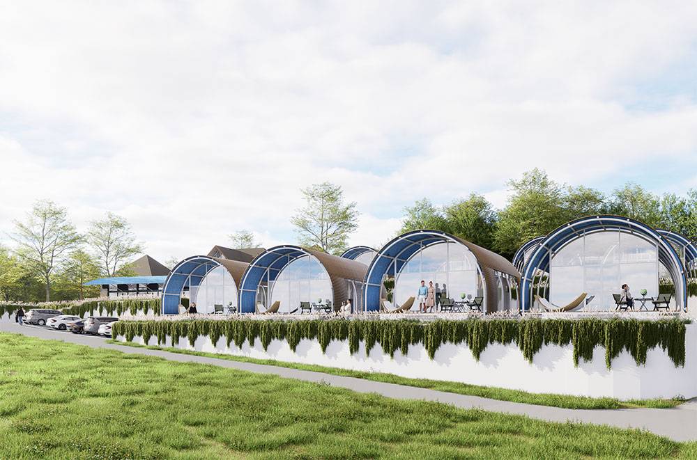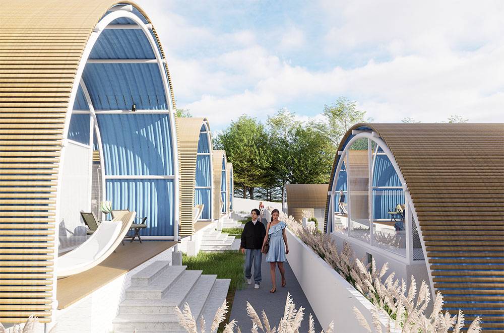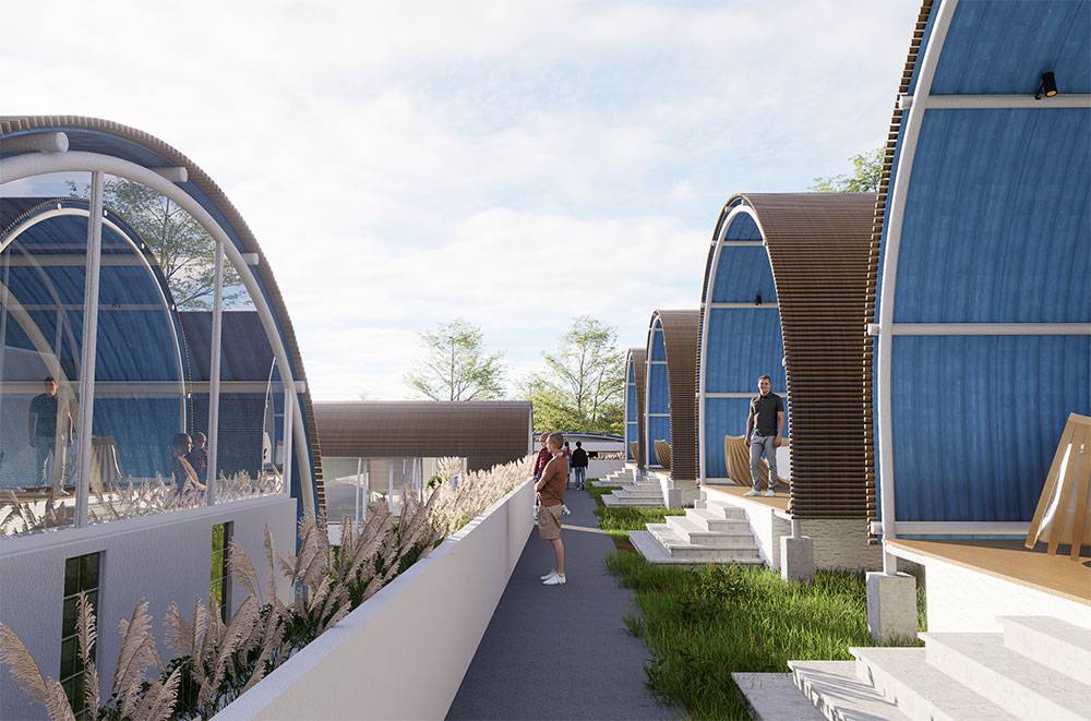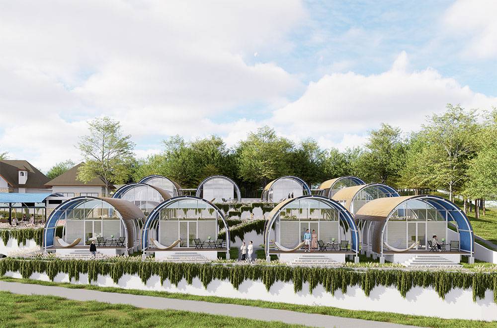 In contrast, the glamping units introduce a lighter, more experimental architectural expression. Semi-arched and tent-inspired forms create a distinct identity while maintaining climatic comfort and visual openness. Elevated platforms, transparent façades, and integrated outdoor decks allow guests to experience the landscape directly, blurring the boundary between shelter and nature.