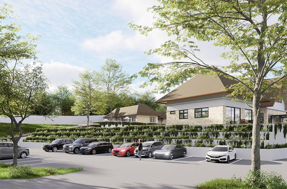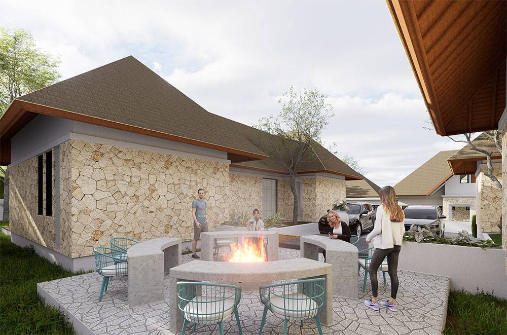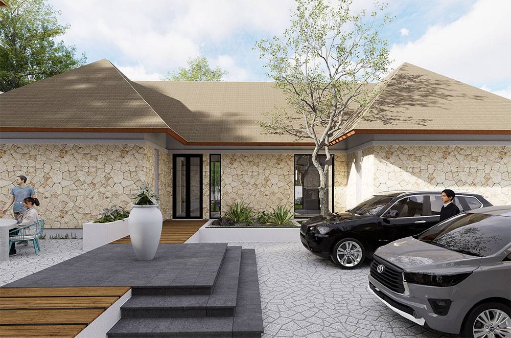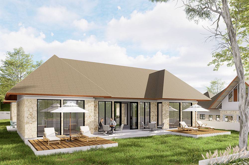 Architecturally, the private villas adopt a refined tropical highland language, characterized by pitched roofs, stone-textured walls, warm timber elements, and generous terraces. These villas are designed as permanent, grounded structures that offer comfort, privacy, and a strong relationship with the surrounding landscape.