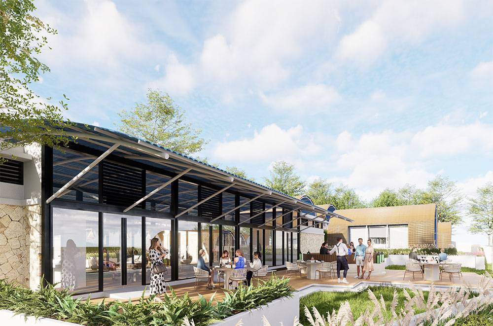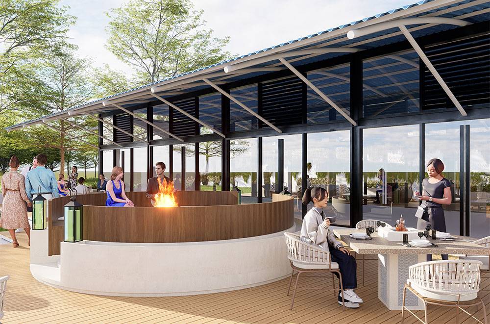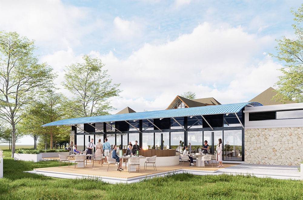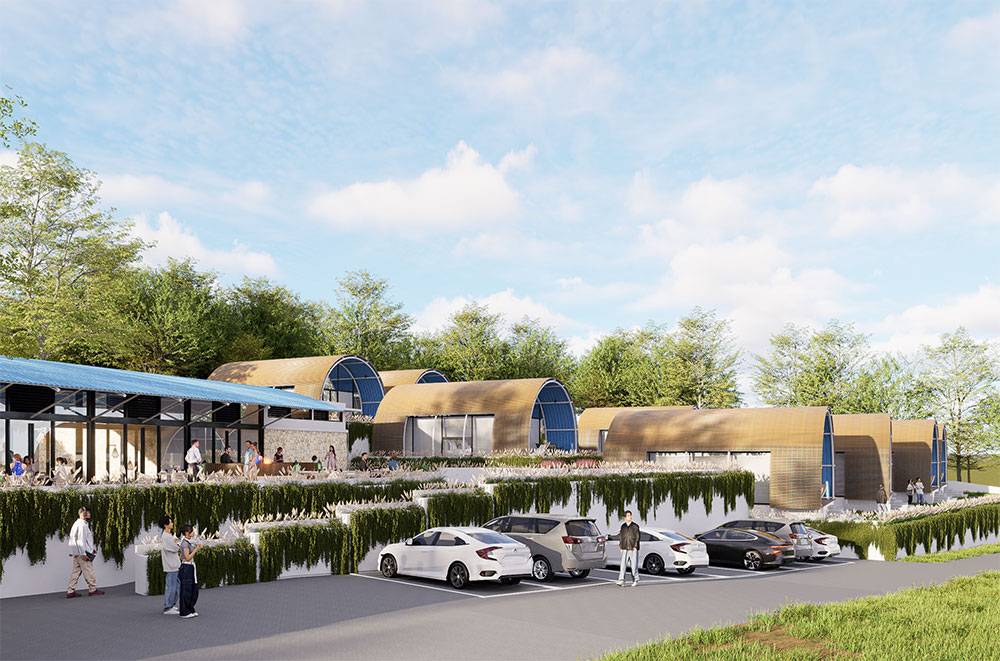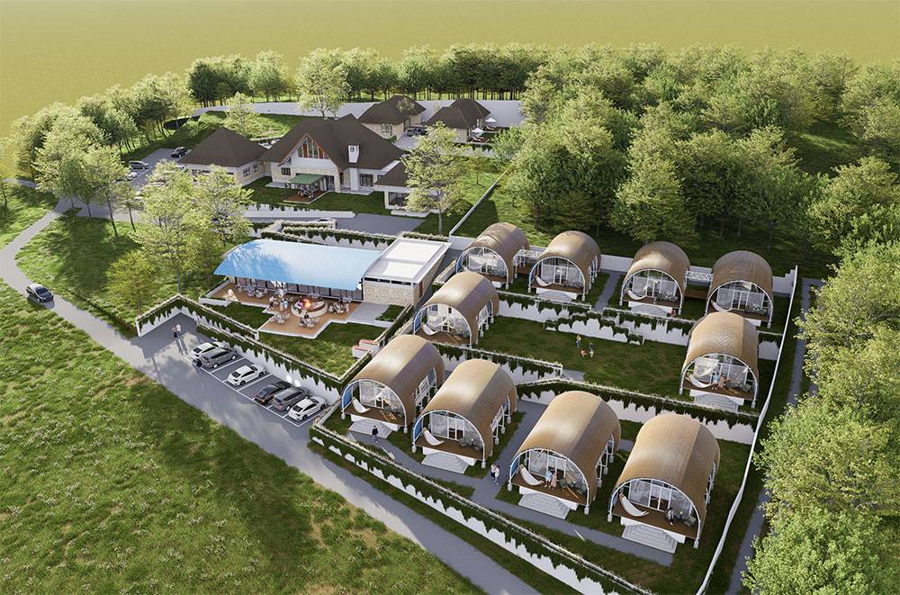 Shared facilities—such as dining pavilions, gathering spaces, and outdoor lounges—are positioned as social anchors between the villa and glamping zones. These structures are designed to be open, welcoming, and visually connected to green fields and forest edges, reinforcing the sense of community without disrupting privacy.