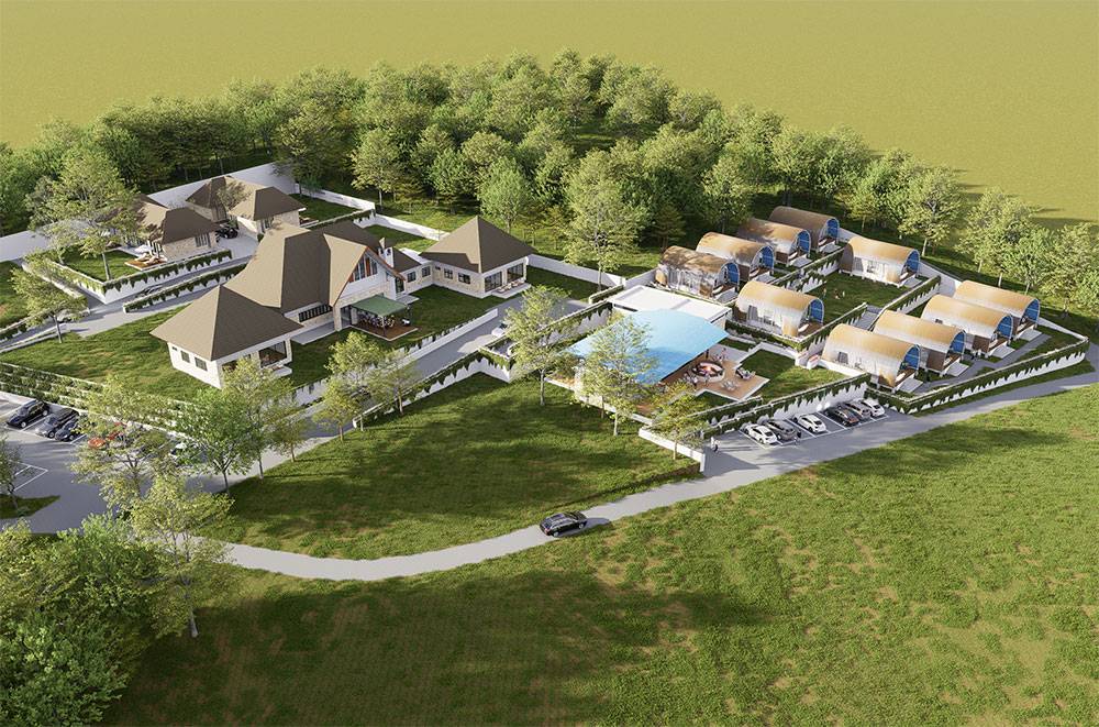 The masterplan is organized as a layered resort village, with a clear separation between villa accommodations, glamping clusters, and shared communal facilities. The layout follows the natural contours of the site, preserving existing greenery and creating generous green buffers that enhance privacy, tranquility, and immersion in nature. Vehicular access is carefully managed to keep internal areas pedestrian-friendly and serene.