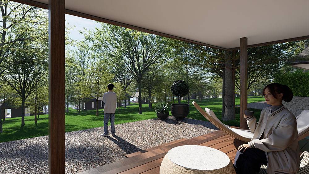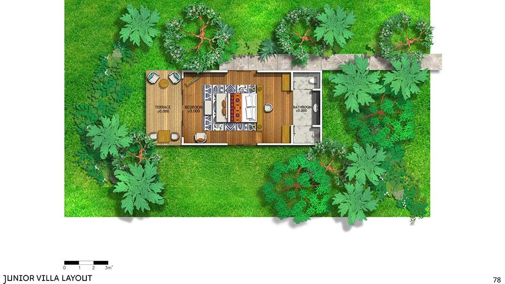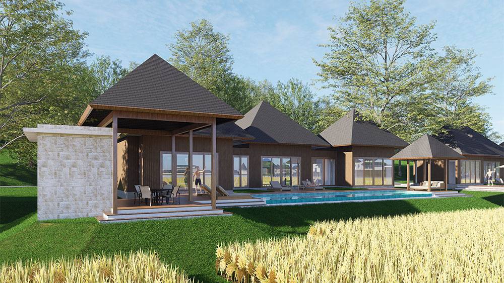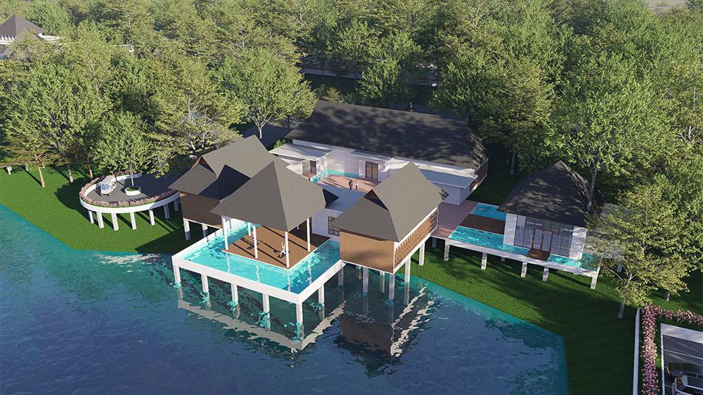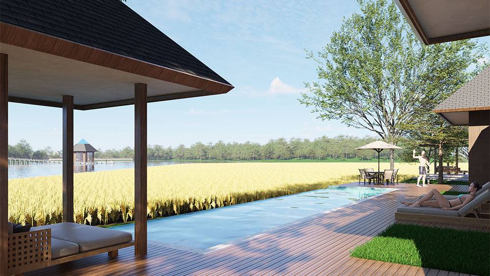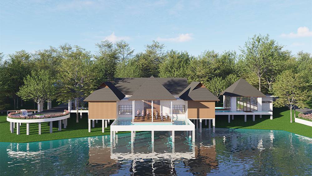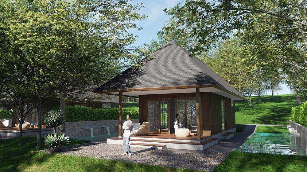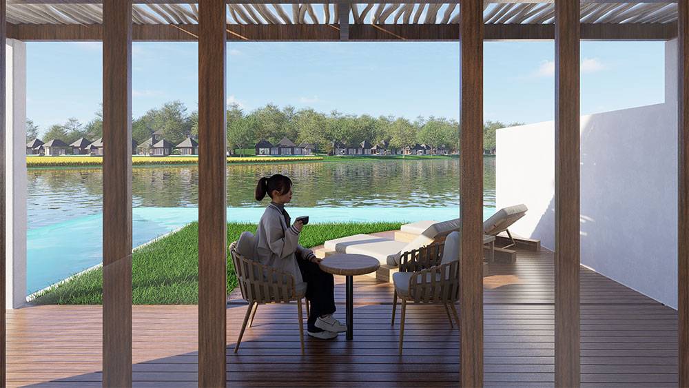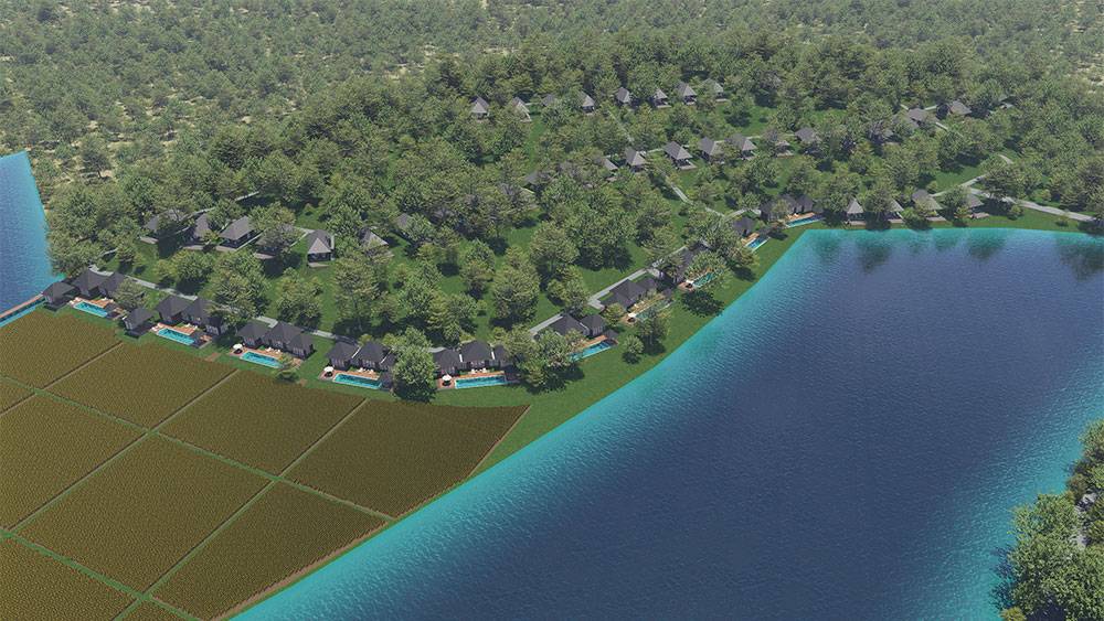 The masterplan adopts a clustered layout along the lakefront and the rubber tree–covered hills, carefully responding to the site’s topography and microclimate. Existing features, including the fish pond and chicken farm, are preserved and integrated into the overall spatial strategy, reinforcing the resort’s relationship with the land and local livelihoods.